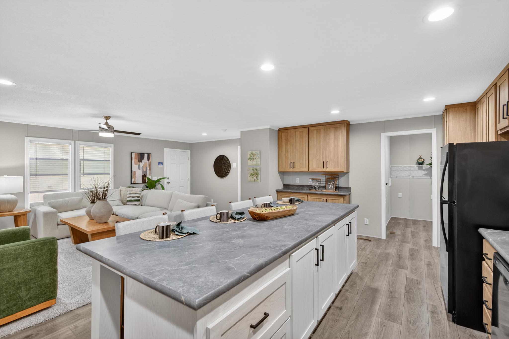 The Paramount Sectional / Silverton 2856H32174 built by Redman Homes Topeka offers 1,493 sq. ft. of thoughtfully designed living space, featuring 3 bedrooms and 2 bathrooms. The inviting floor plan blends the living room, dining area, and kitchen, creating a seamless flow for daily life. The private primary suite provides a peaceful escape, while two additional bedrooms offer versatility. The Silverton 2856H32174 delivers comfort and modern living in a well-crafted home.